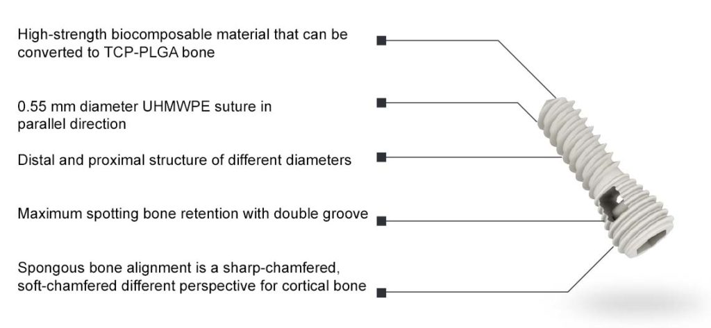 It provides perfect implementation, rehabilitation, and result opportunities to the patient and the doctor thanks to its biocomposite (PLGA + TCP) implant and UHMWPE suture materials.