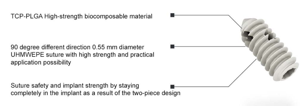 Designed with the base idea of implant + double suture with its perfect performance coming from the past, PENTAS provides perfect implementation, rehabilitation, and result opportunities to the patient and the doctor thanks to its biocomposite (PLGA + TCP) implant and UHMWPE suture materials.